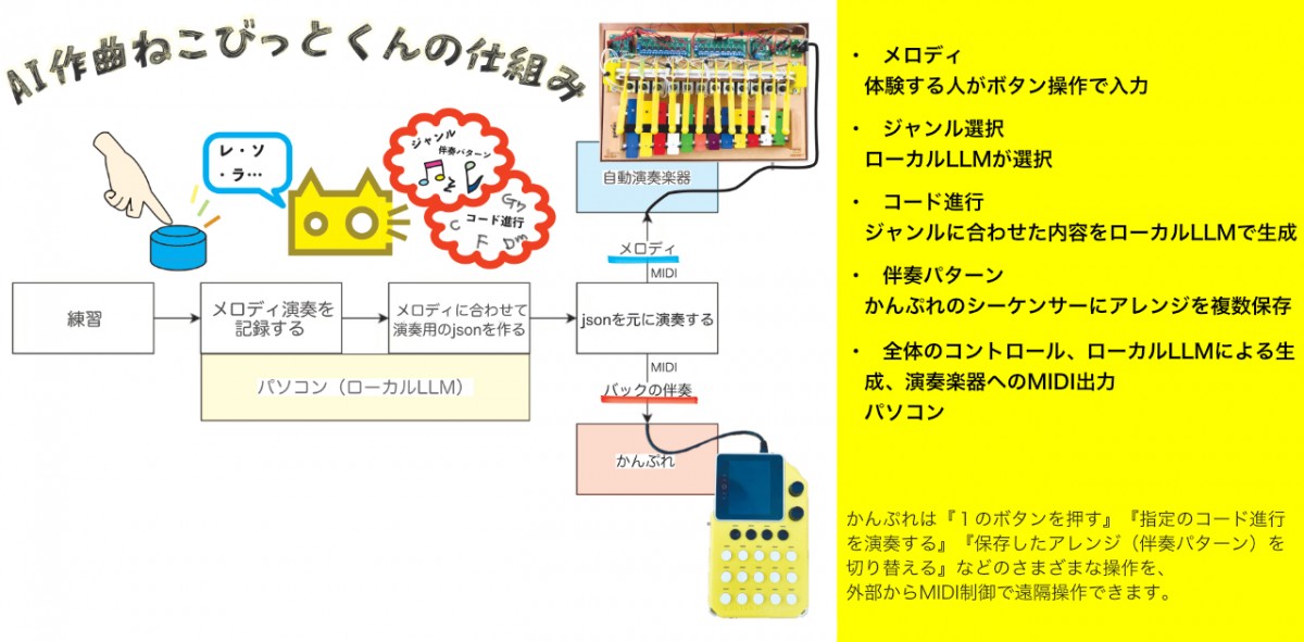 左:人間が入力したメロディをMIDI自動演奏鉄琴が、生成されたコード進行を伴奏パターン機能を用いてかんぷれが演奏する 右:Maker Faire Tokyo 2025 necobitブース 全景。LLMの入ったMac・操作説明ディスプレイと操作ボタン・自動演奏鉄琴・かんぷれを持ったねこびっとくんは、操作説明の喋り音声に合わせて光る。 生成された音楽をどう出力して見せるかもnecobitにとって大きなポイント。